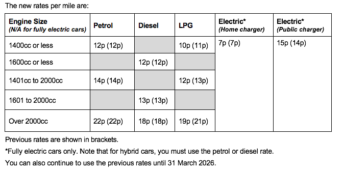 For employees using their own cars for business purposes, the Advisory Mileage Allowance Payment (AMAP) tax-free reimbursement rate continues to be 45p per mile (plus 5p per passenger) for the first 10,000 business miles, reducing to 25p per mile thereafter.